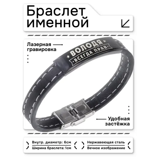 Именной браслет с гравировкой 'Всегда прав' из кожи и нержавеющей стали.