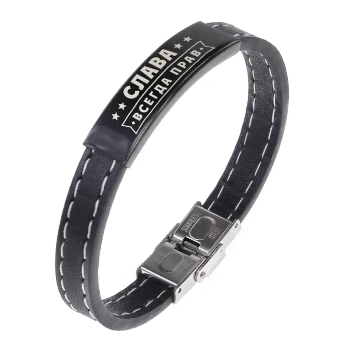 Именной браслет с гравировкой 'Всегда Прав'. Изготовлен из кожи и нержавеющей стали.