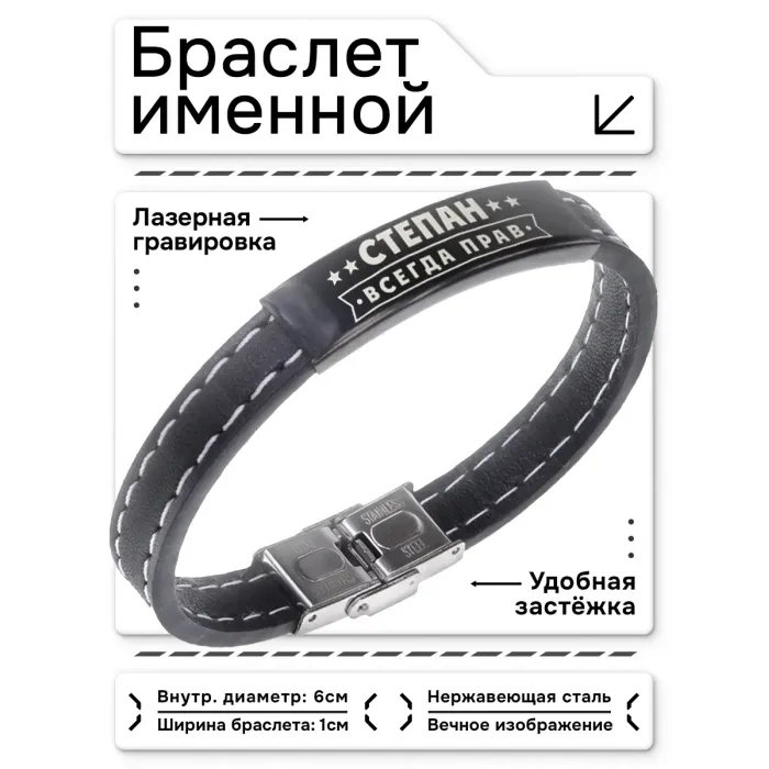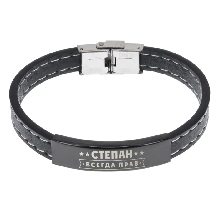 Именной браслет из кожи и нержавеющей стали с гравировкой.