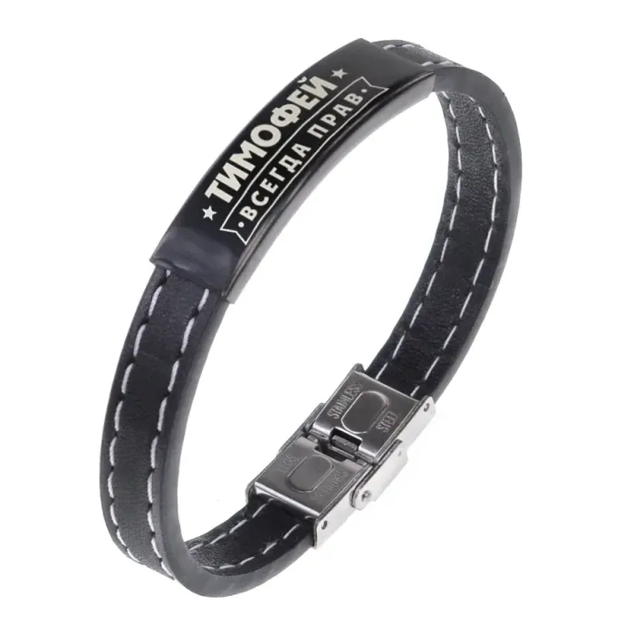 Именной браслет с гравировкой из кожи и нержавеющей стали.