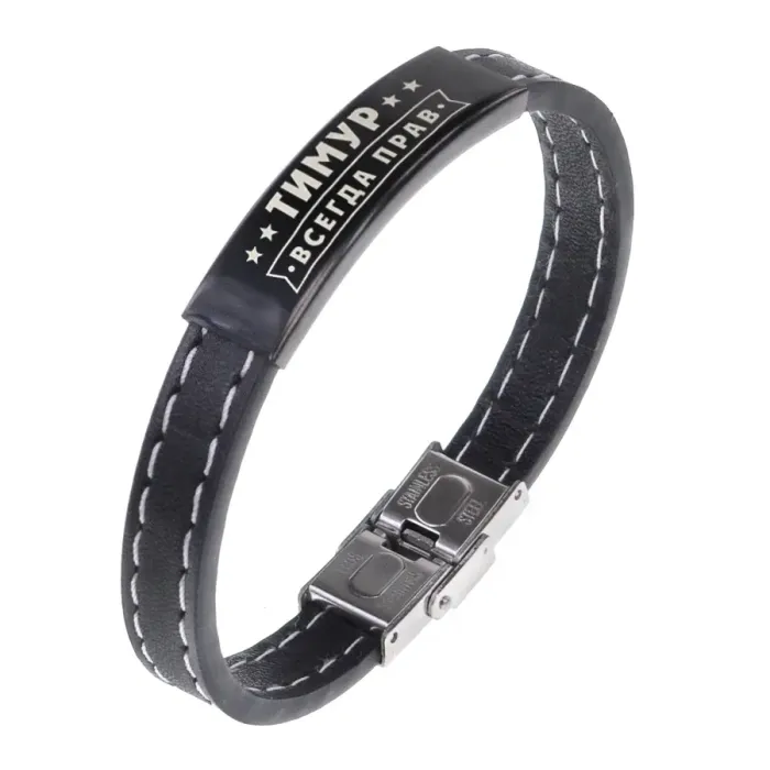 Именной браслет с гравировкой из кожи и нержавеющей стали.