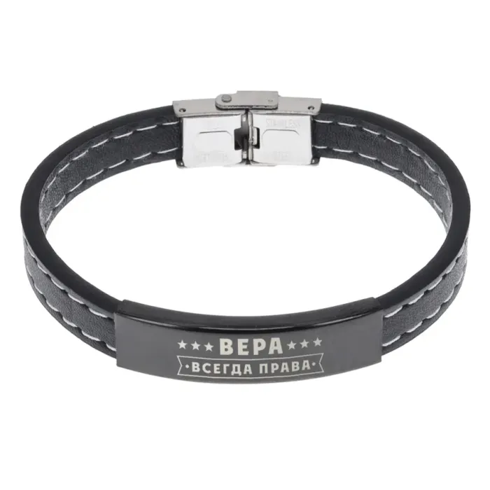 Именной браслет с гравировкой «Всегда права». Изготовлен из кожи и нержавеющей стали.