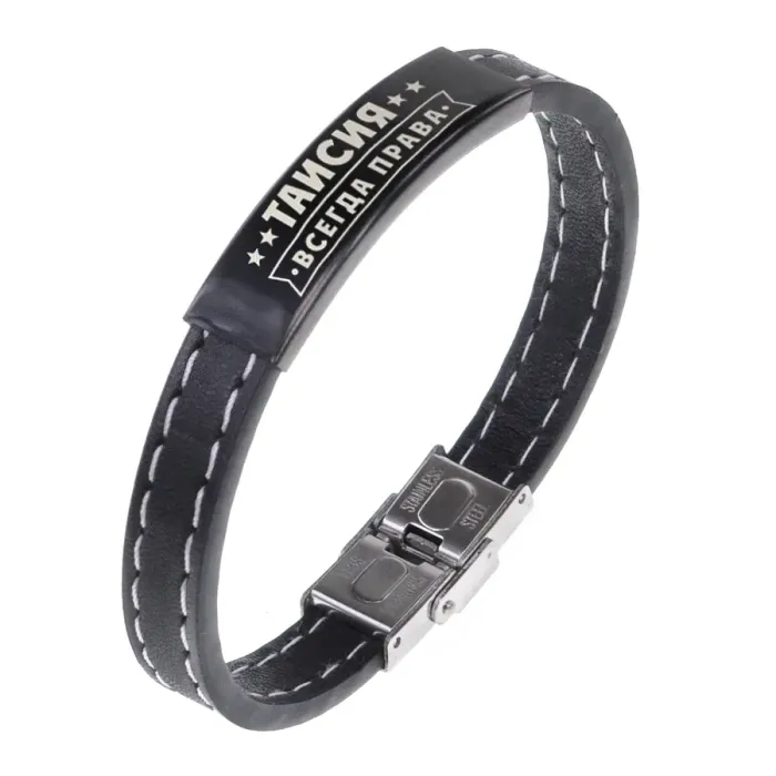 Именной браслет с гравировкой 'Всегда права'. Материалы: кожа и нержавеющая сталь.