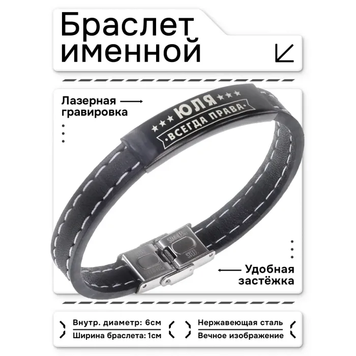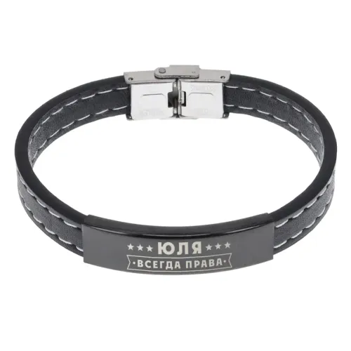 Именной браслет с гравировкой «Юлия Всегда права». Материал: кожа и нержавеющая сталь.