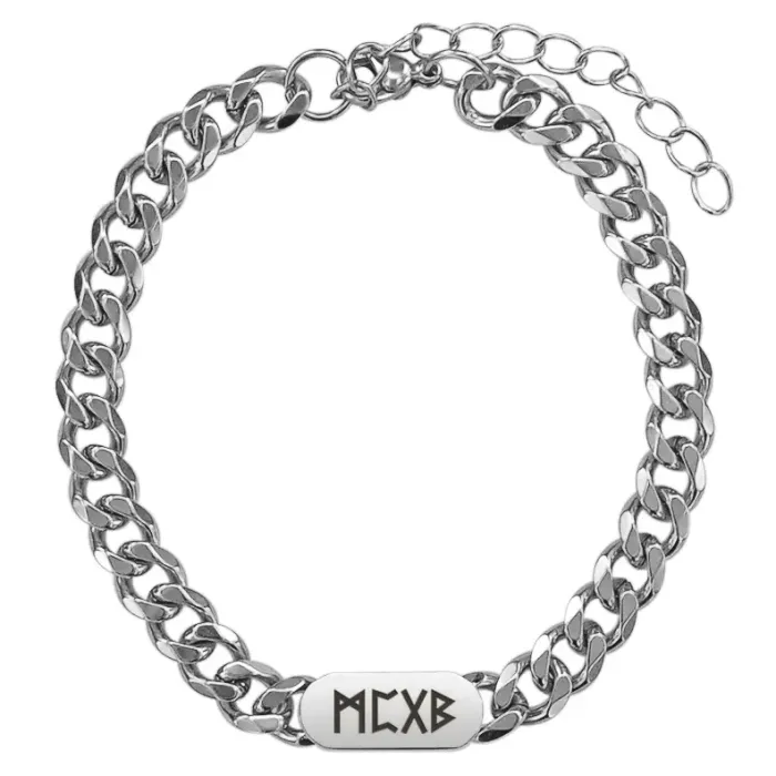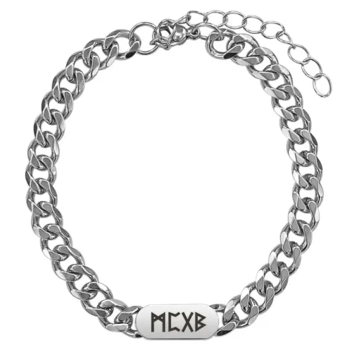 Браслет-цепь из нержавеющей стали с гравировкой рун Манназ, Перт, Гебо и Беркана.