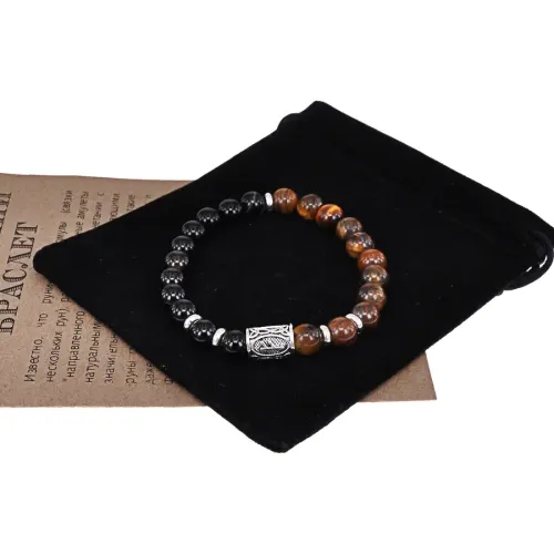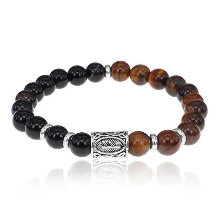 Рунический стрейч-браслет с камнями чёрный агат и тигровый глаз, с символом руны Феху.