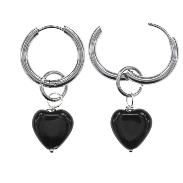 Серьги-сердца из гипоаллергенного сплава с натуральным камнем чёрный агат.