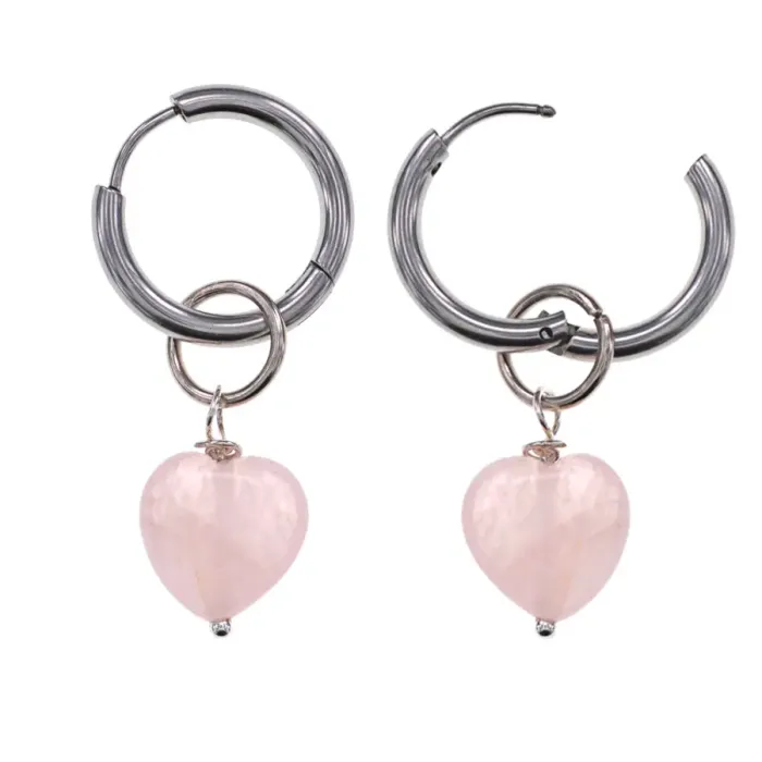 Серьги-сувенир в форме сердца с натуральным камнем розовый кварц на швензах типа «Конго».
