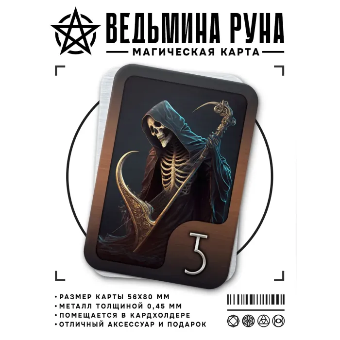 Магическая карта с викканской символикой, выполненная из металла толщиной 0,45 мм. Размер карты составляет 56х80 мм. Упаковка включает прозрачный пакетик с описанием. Руна серпа (косы) традиционно используется для помощи в адаптации к переменам и изменениям в планах, мыслях и поведении. Эта карта символизирует положительные изменения во всех сферах жизни, что делает её отличным подарком или сувениром для тех, кто стремится к улучшению своей судьбы.