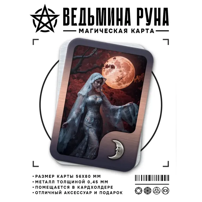 Магическая карта с викканской символикой, выполненная из металла толщиной 0,45 мм. Размер карты составляет 56х80 мм, что делает её удобной для ношения и использования в ритуалах. Упакована в прозрачный пакетик с описанием, что позволяет сохранить её в идеальном состоянии. Магия луны известна своей силой и опасностью, однако лунная руна ведьм обеспечивает надёжную защиту. Она помогает обострить интуицию и открывает новые знания, предоставляя неожиданные подсказки в важные моменты.