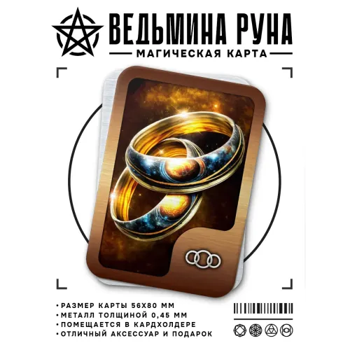 Магическая карта с викканской символикой, выполненная из металла толщиной 0,45 мм. Размер карты составляет 56х80 мм. Упакована в прозрачный пакетик с описанием. Эта карта традиционно используется для заключения союзов и сделок, а также помогает в любви, бизнесе и дружбе. Переплетённые кольца на карте символизируют защиту, напоминая о кольчугах воинов, что добавляет ей особую значимость.