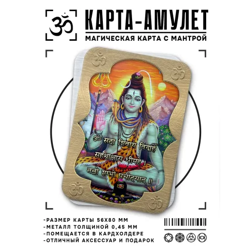 Карта-амулет с мантрой Шива — это уникальный магический предмет, который сочетает в себе силу древних традиций и современный дизайн. Изготовленная из металла толщиной 0,45 мм, она имеет размеры 5,6х8 см и поставляется в удобном пакетике с описанием.