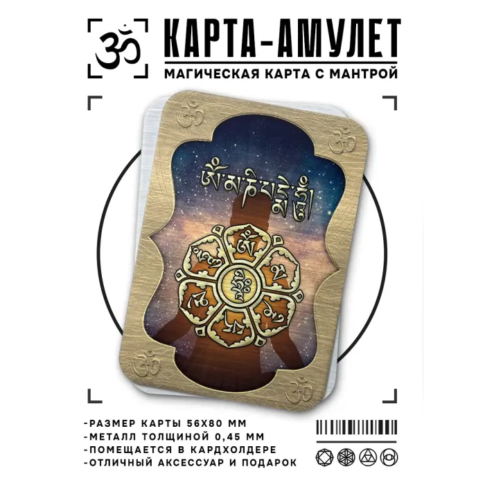 Карта-амулет с мантрой Ом Мани Падме Хум — это магический предмет, который помогает обрести чистоту духа и мудрость Будды. Изготовленная из металла толщиной 0,45 мм, она имеет размеры 5,6х8 см и поставляется в пакетике с описанием. Созерцание этой мантры способствует трансформации привязанностей к эгоистичным желаниям в созидание и процветание. Такой амулет станет не только стильным аксессуаром, но и символом духовного роста.