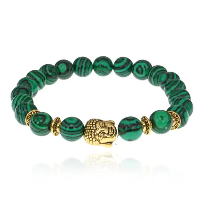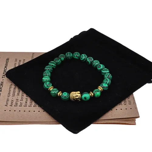 Стрейч-браслет с бусинами в виде головы Будды и синтетическим камнем малахит.