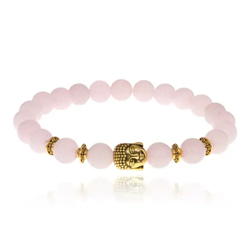 Стрейч-браслет с бусинами из розового кварца и декоративным элементом в виде головы Будды.