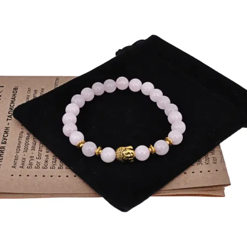 Материал и изготовление: Бусины из натурального розового кварца диаметром 8 мм. Декоративная бусина Будды выполнена из бижутерного сплава с покрытием под золото.