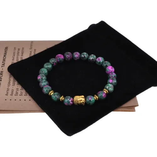 Браслет-амулет с подвеской в виде головы Будды и бусинами из синтетического камня.