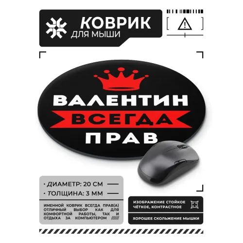 Коврик для мыши именной Валентин Всегда прав, d.20см KM1257