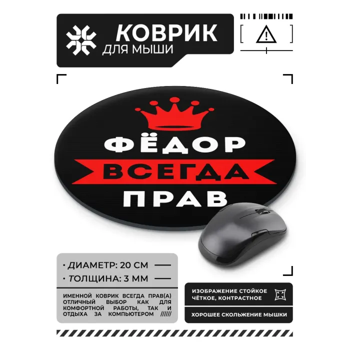 Именной коврик для компьютерной мыши с изображением и надписью "Федор Всегда прав".