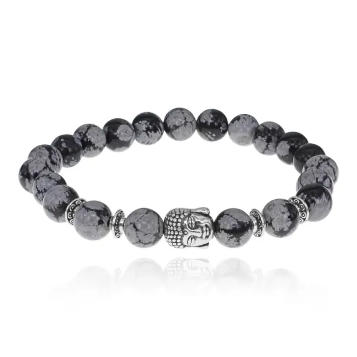 Браслет-амулет Будда с нат. камнем Снежный обсидиан 8мм BSH-01-14S
