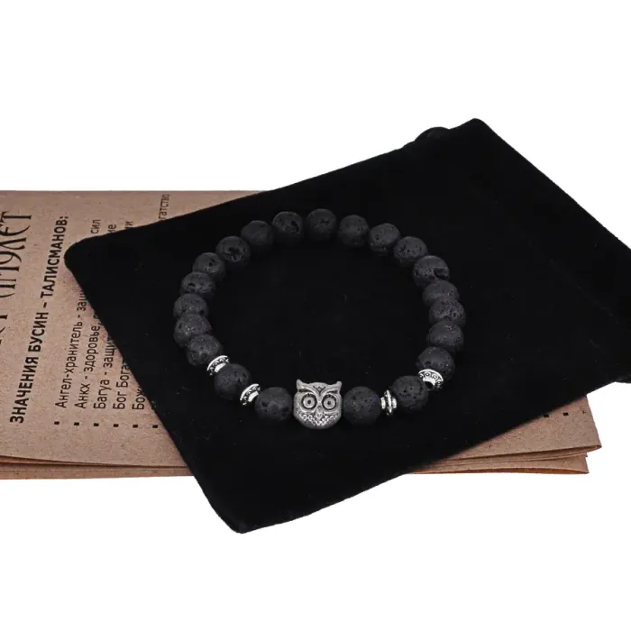 Браслет-амулет с подвеской в виде совы и бусинами из натурального камня лава.