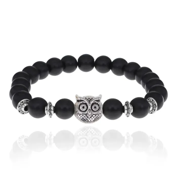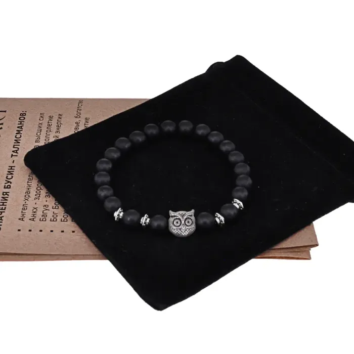 Браслет-амулет с подвеской в виде совы и бусинами из синтетического шунгита.