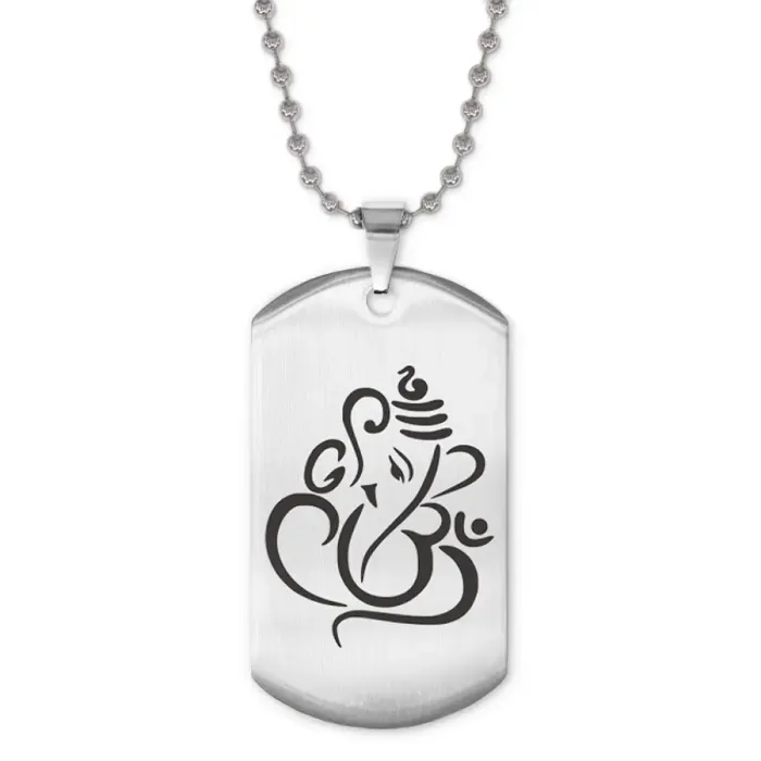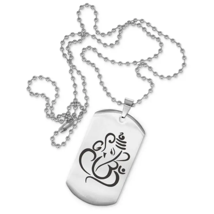 Жетон на цепочке с изображением Ганеши. Изготовлен из нержавеющей стали с зеркальной полировкой и лазерной гравировкой.