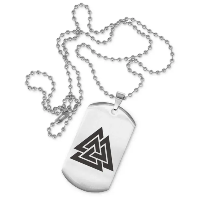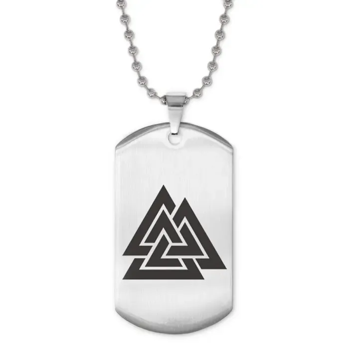Сувенирный жетон на цепочке с изображением символа Валькнут. Изготовлен из нержавеющей стали с лазерной гравировкой.