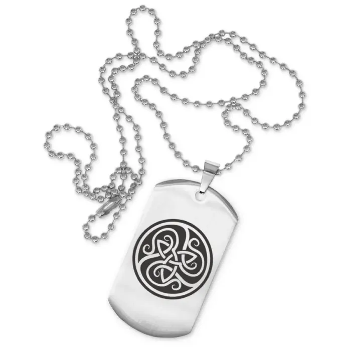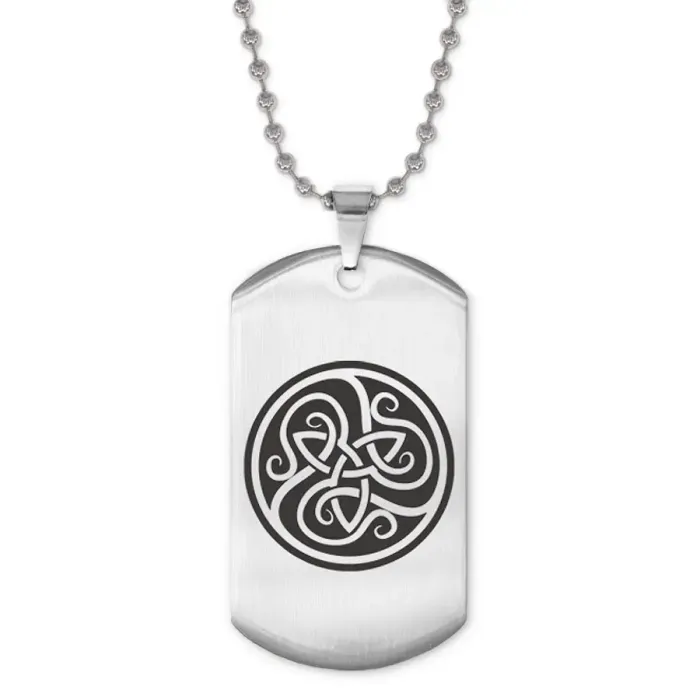 Сувенирный жетон на цепочке из нержавеющей стали с лазерной гравировкой символа трикветр.