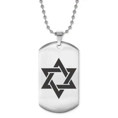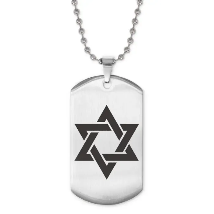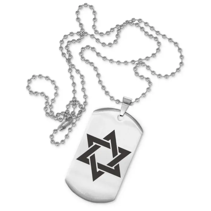Жетон на цепочке с символом Звезды Давида. Изготовлен из нержавеющей стали с зеркальной полировкой и лазерной гравировкой.