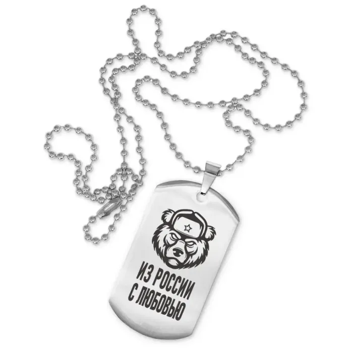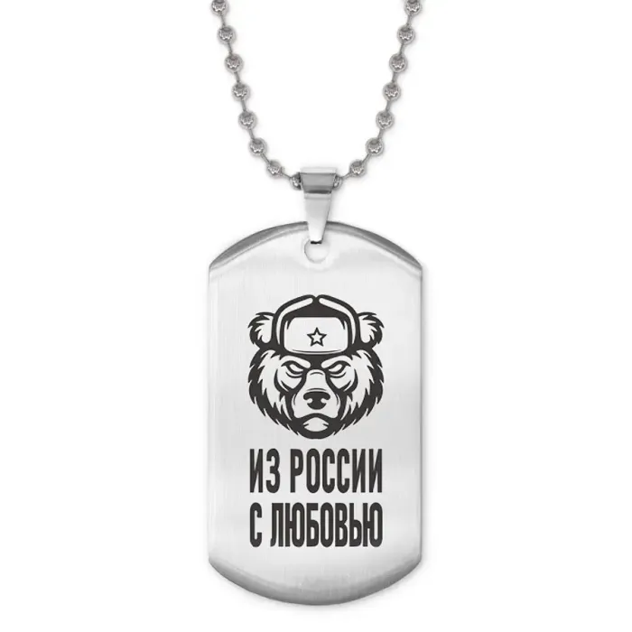 Жетон на цепочке «Из России с любовью» — сувенирный аксессуар из нержавеющей стали с зеркальной полировкой и лазерной гравировкой.