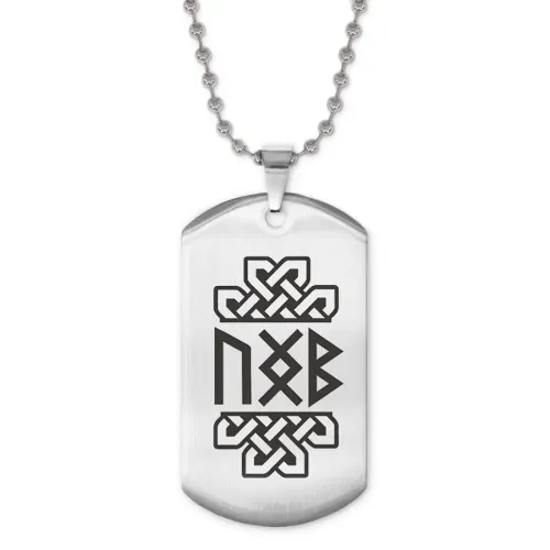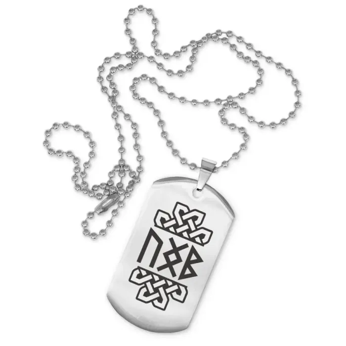 Жетон на цепочке — это стильный и символичный аксессуар, который сочетает в себе эстетику и традиционные рунические символы. Изготовленный из высококачественной полированной нержавеющей стали, он имеет размеры 50x28 мм и комплектуется регулируемой цепочкой длиной 60 см.