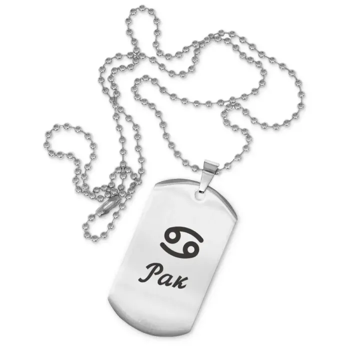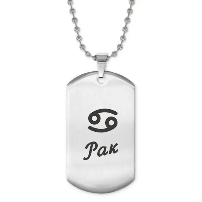 Сувенирный жетон на цепочке с изображением знака зодиака Рак. Изготовлен из полированной нержавеющей стали, имеет лазерную гравировку.