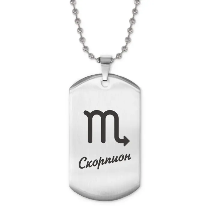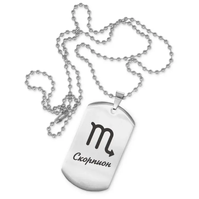 Жетон на цепочке с изображением знака зодиака Скорпион. Изготовлен из нержавеющей стали с зеркальной полировкой.