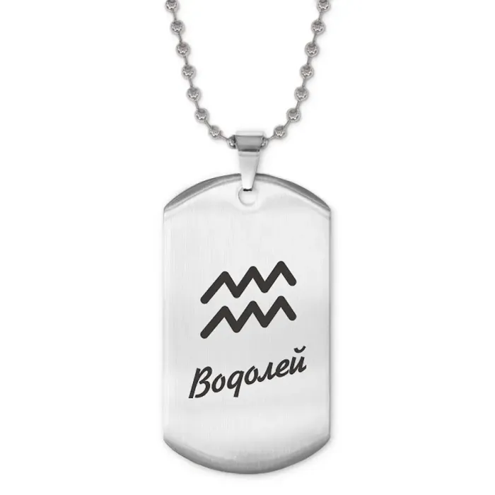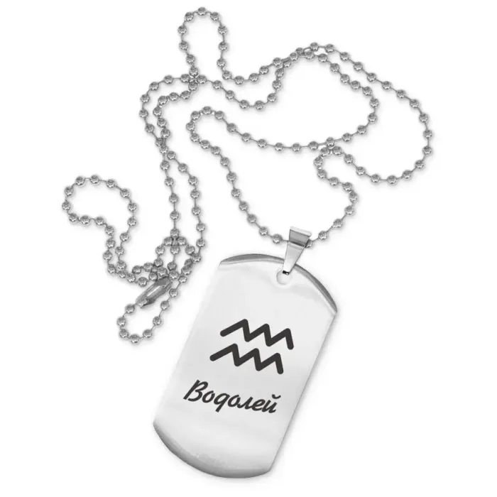 Сувенирный жетон на цепочке с изображением знака зодиака Водолей. Изготовлен из нержавеющей стали с зеркальной полировкой и лазерной гравировкой.
