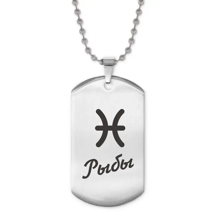 Сувенирный жетон на цепочке для знака зодиака Рыбы. Изготовлен из полированной нержавеющей стали, изображение нанесено лазерной гравировкой.