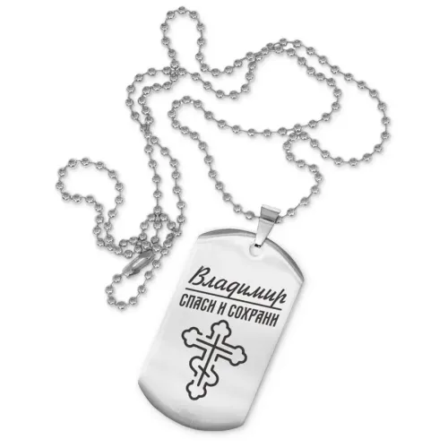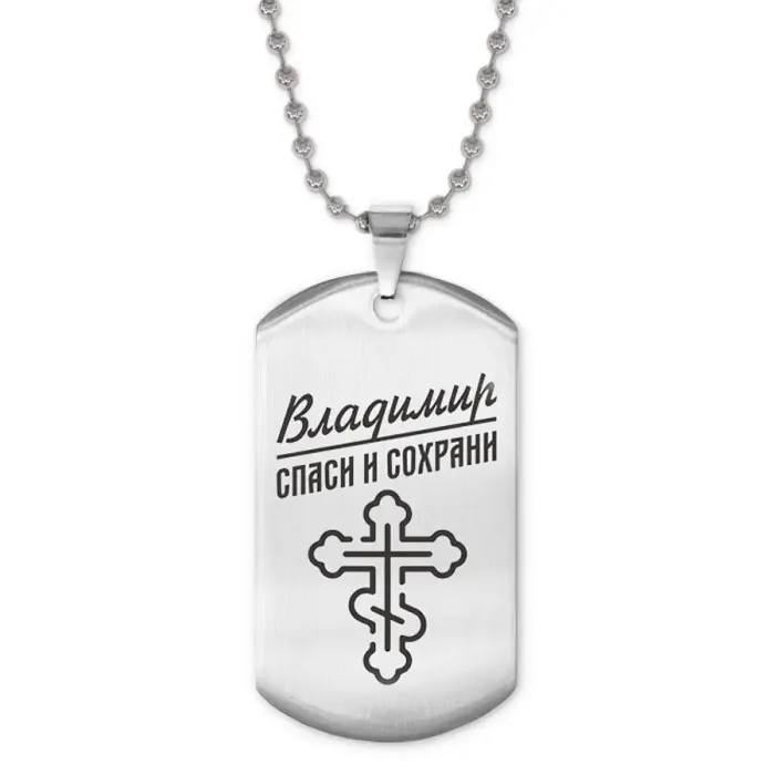 Мужской жетон на цепочке с именем Владимир. Изготовлен из полированной нержавеющей стали с лазерной гравировкой изображения.