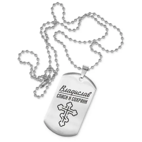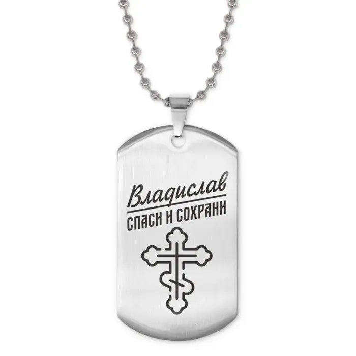 Мужской именной жетон-кулон из нержавеющей стали с лазерной гравировкой на цепочке.