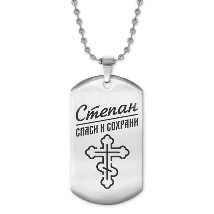 Мужской сувенирный жетон на цепочке из нержавеющей стали с лазерной гравировкой.