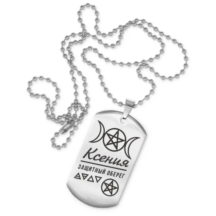 Размеры и комплектация: Размер жетона: 50x28 мм. Длина цепочки: 60 см с возможностью регулировки. Упаковка: прозрачный пакет.