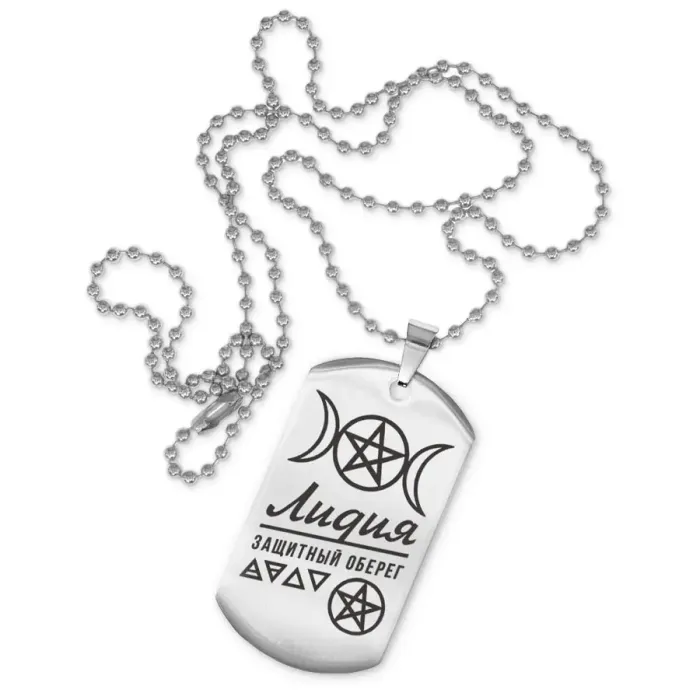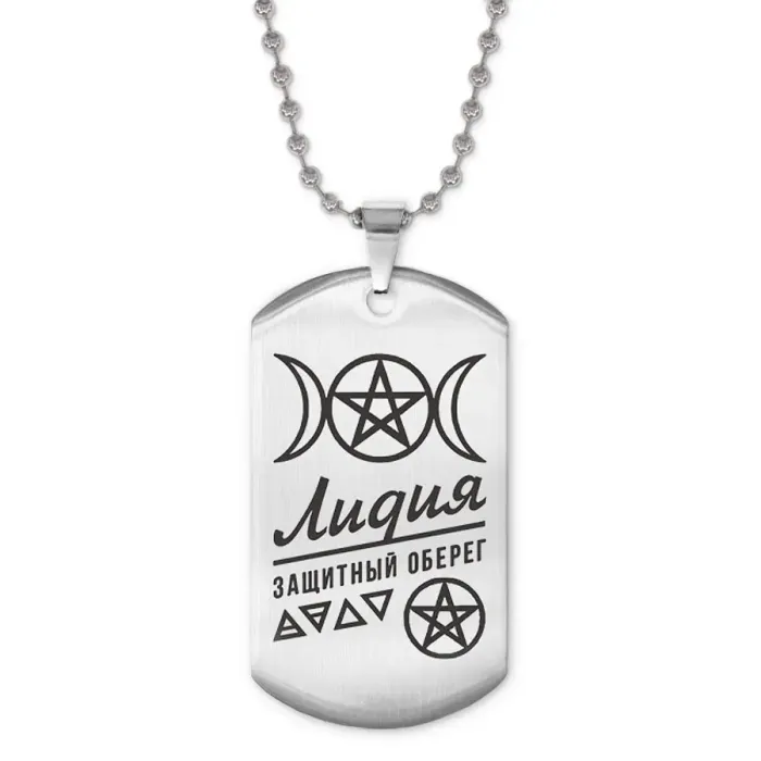 Размеры и комплектация: Размер жетона 50x28 мм. Длина цепочки 60 см с возможностью регулировки. Упаковка: прозрачный пакет.