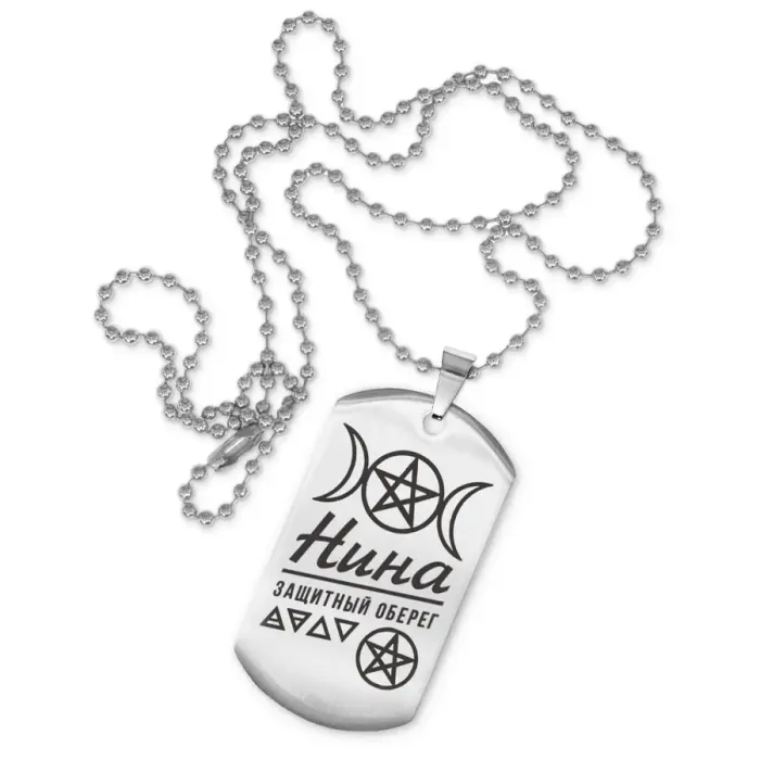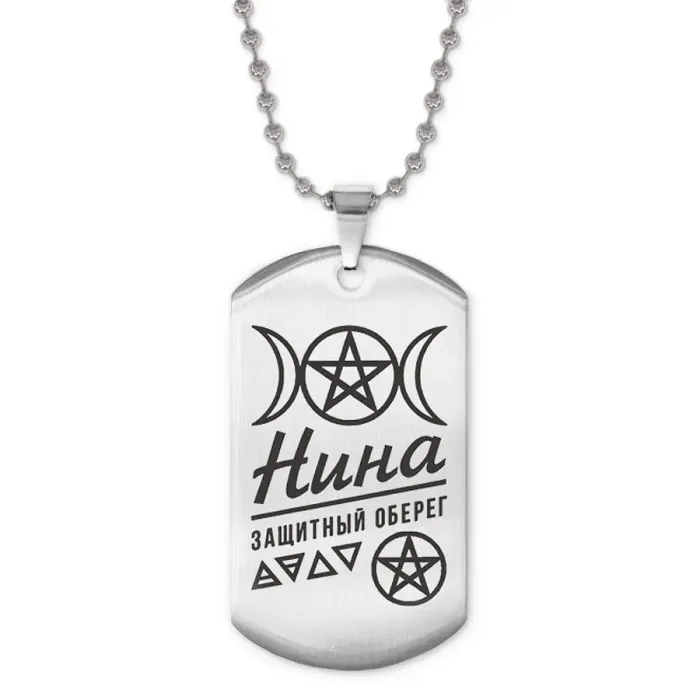 Именной кулон-жетон на цепочке. Изготовлен из нержавеющей стали с зеркальным блеском и лазерной гравировкой.