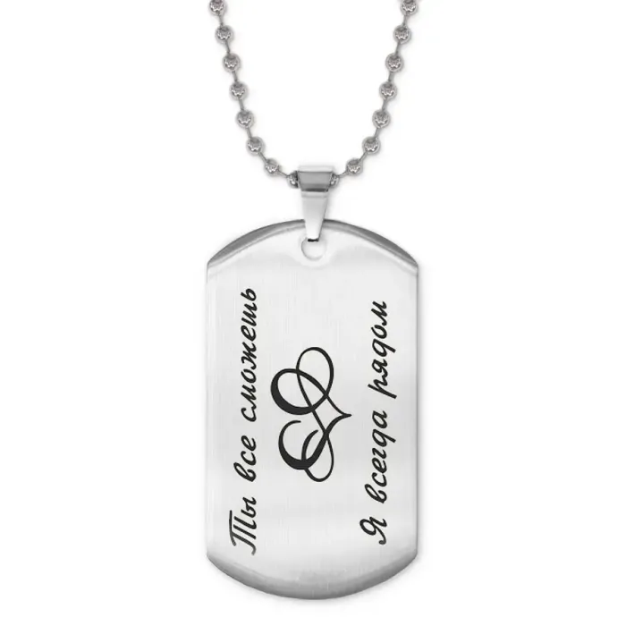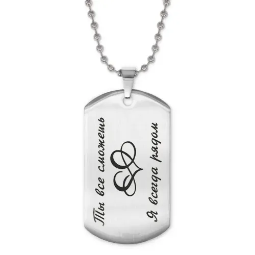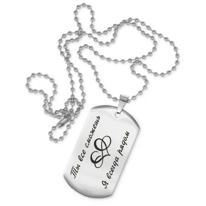 Размеры и комплектация: Размер жетона: 50x28 мм. Длина цепочки: 60 см, регулируемая. Упаковка: прозрачный пакет.