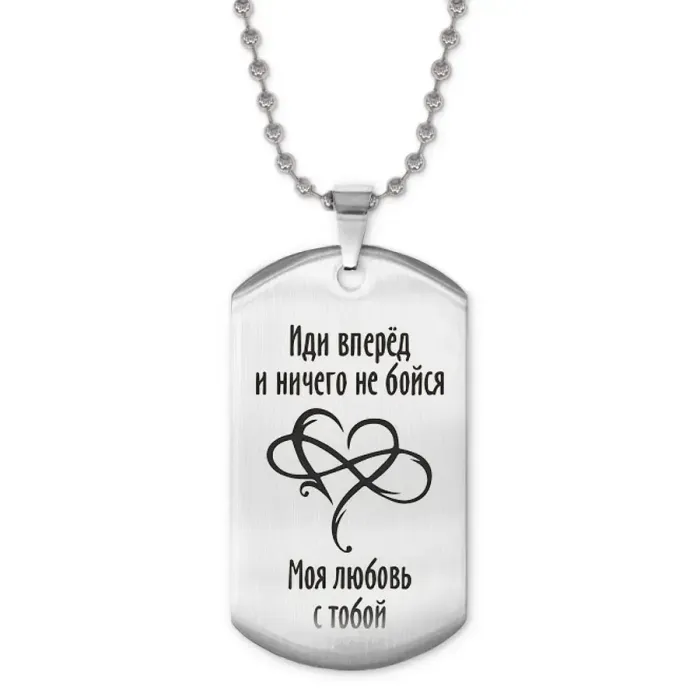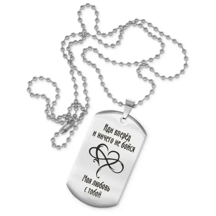 Размеры и комплектация: Размер жетона: 50x28 мм. Длина цепочки: 60 см с возможностью регулировки. Упаковка: прозрачный пакет.