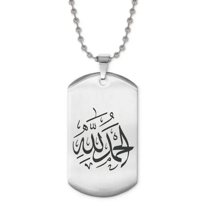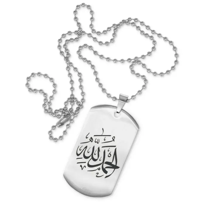 Сувенирный жетон на цепочке с арабской надписью «Альхамдулиллах». Изготовлен из полированной нержавеющей стали с лазерной гравировкой.