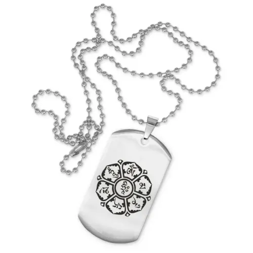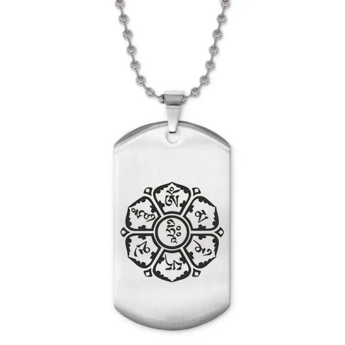 Сувенирный жетон на цепочке с лазерной гравировкой мантры Ом Мани Падме Хум. Изготовлен из полированной нержавеющей стали.