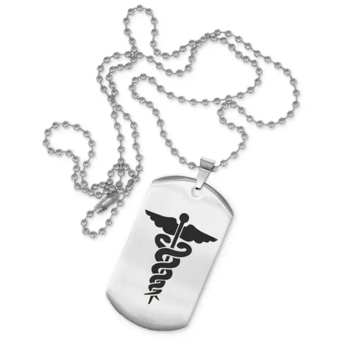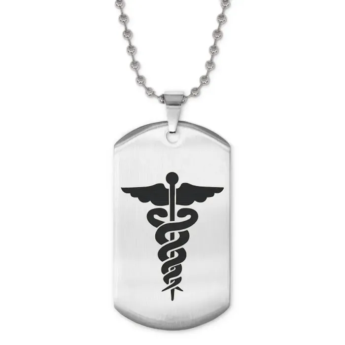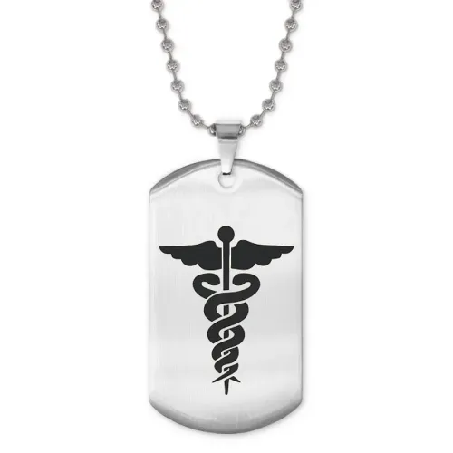 Жетон на цепочке с изображением кадуцея. Изготовлен из нержавеющей стали.