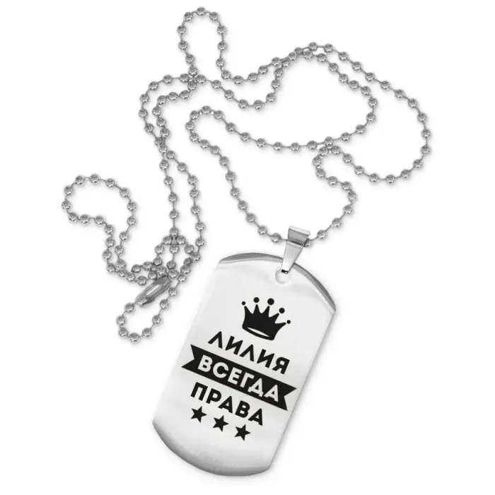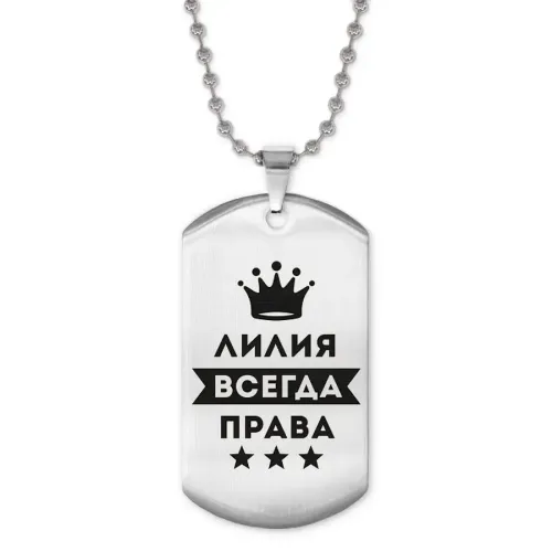 Жетон на цепочке «Лилия Всегда права» — сувенирный аксессуар из нержавеющей стали с зеркальной полировкой и лазерной гравировкой.