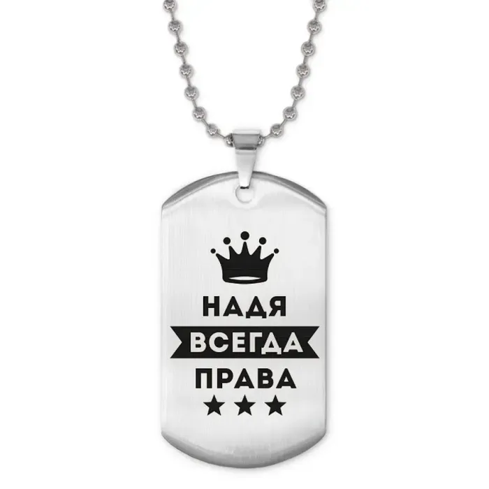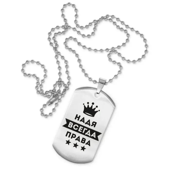 Размеры и комплектация: Размер жетона: 50x28 мм. Длина цепочки: 60 см, с возможностью регулировки. Упаковка: прозрачный пакет.