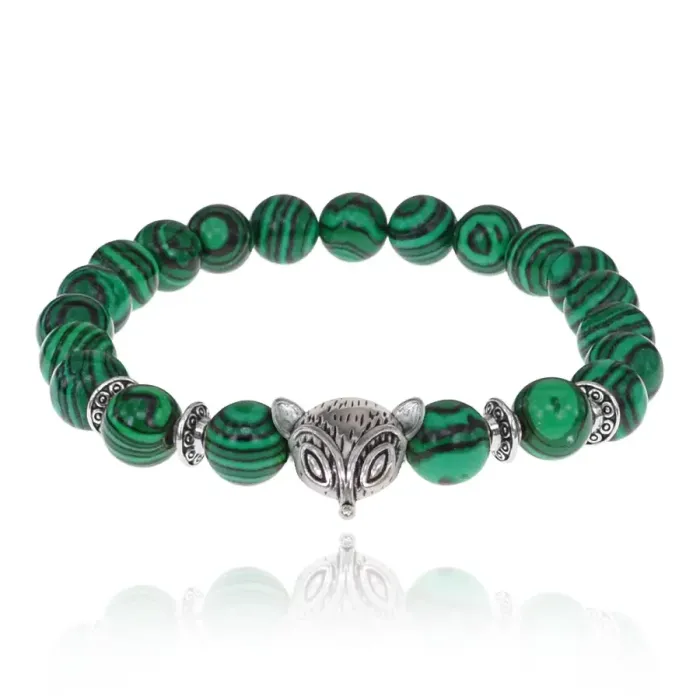 Бижутерный стрейч-браслет с фигуркой лисы и синтетическим камнем малахит.